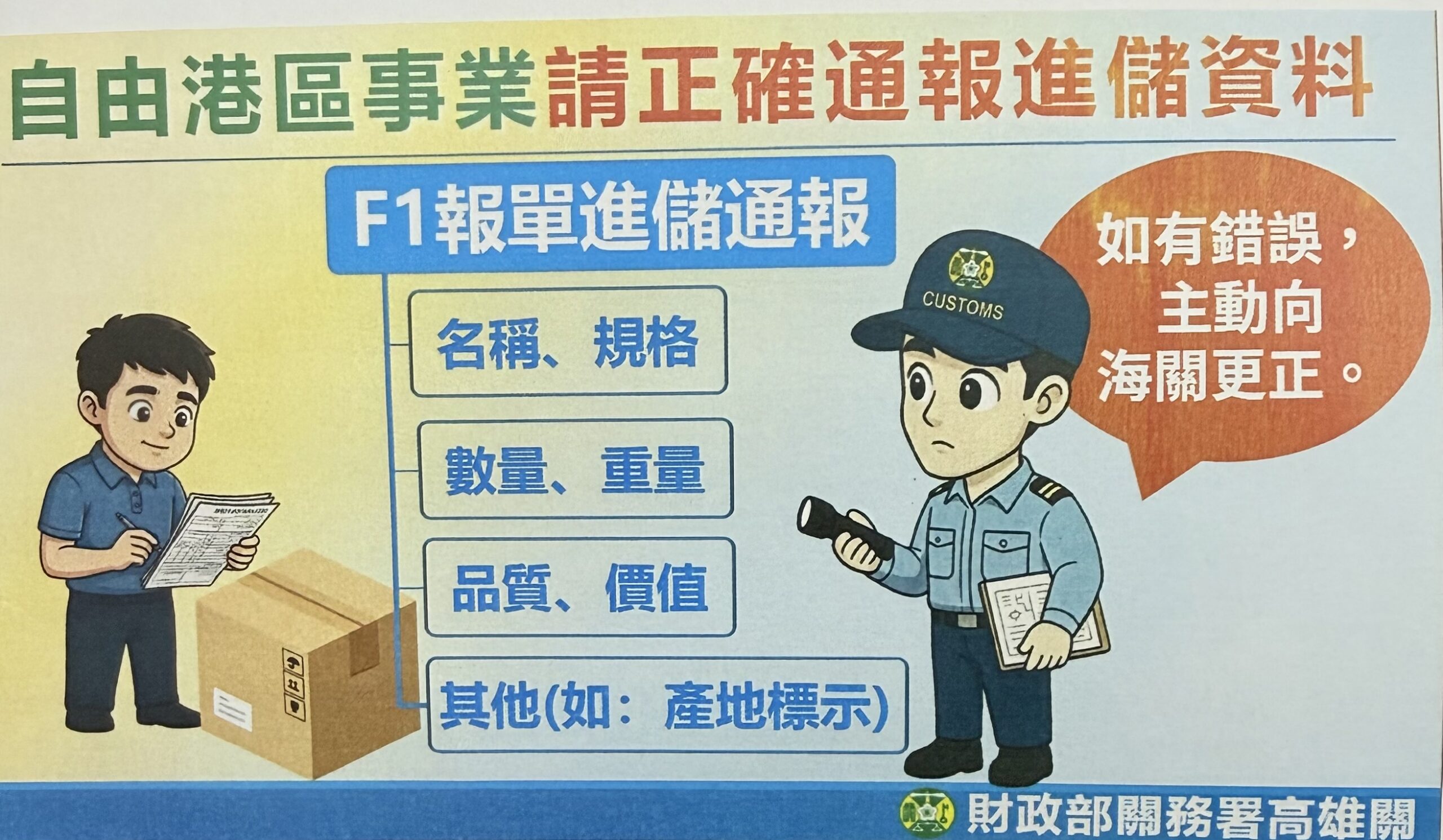 高雄關呼籲業者,自由港區之精神為「低度行政管制、高度自主管理」,自由港區事業如遇有進出倉貨物與申報之貨名不符之情事,應主動立即通報海關;如未主動更正並經海關查獲,依設管條例第