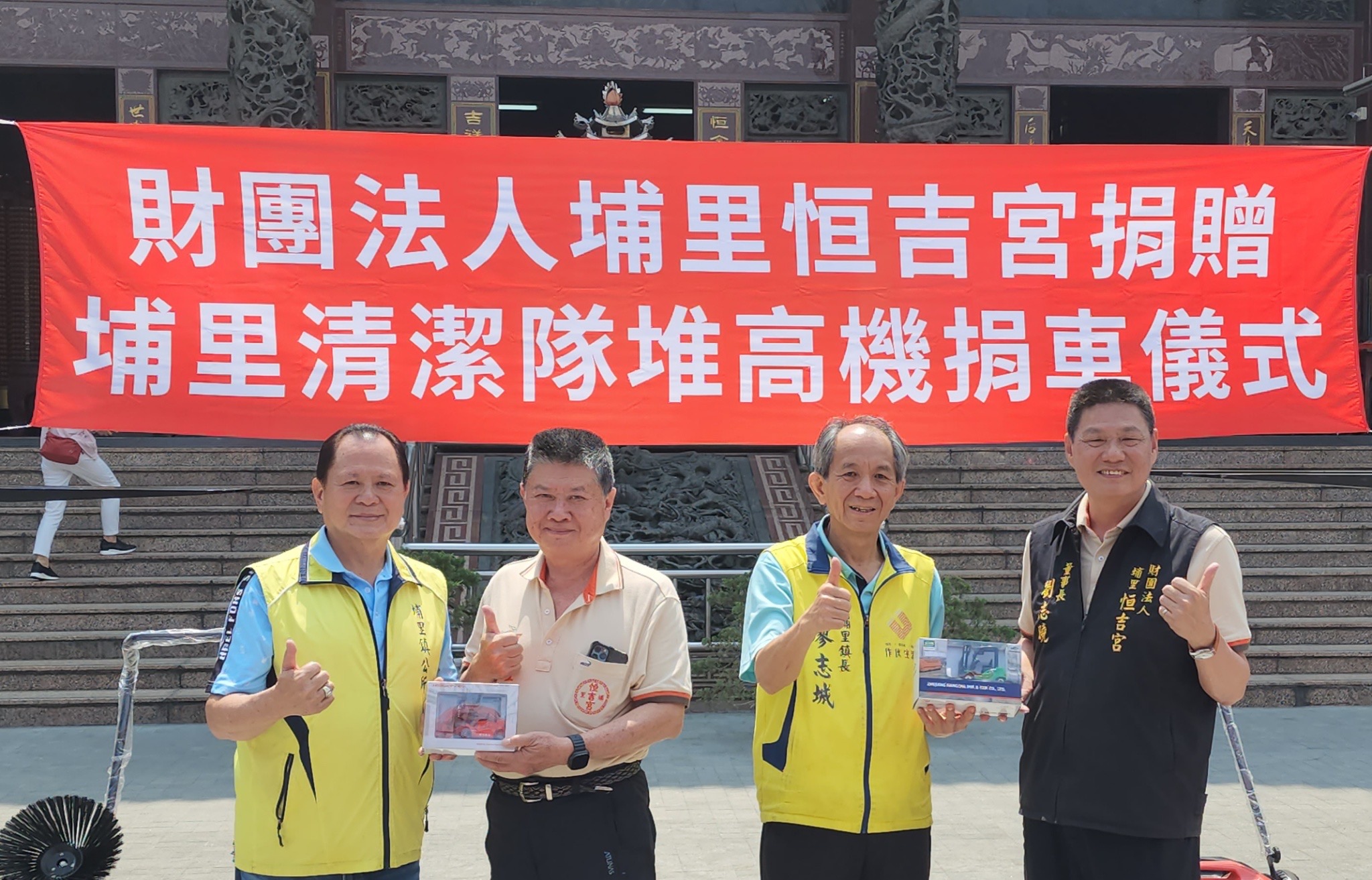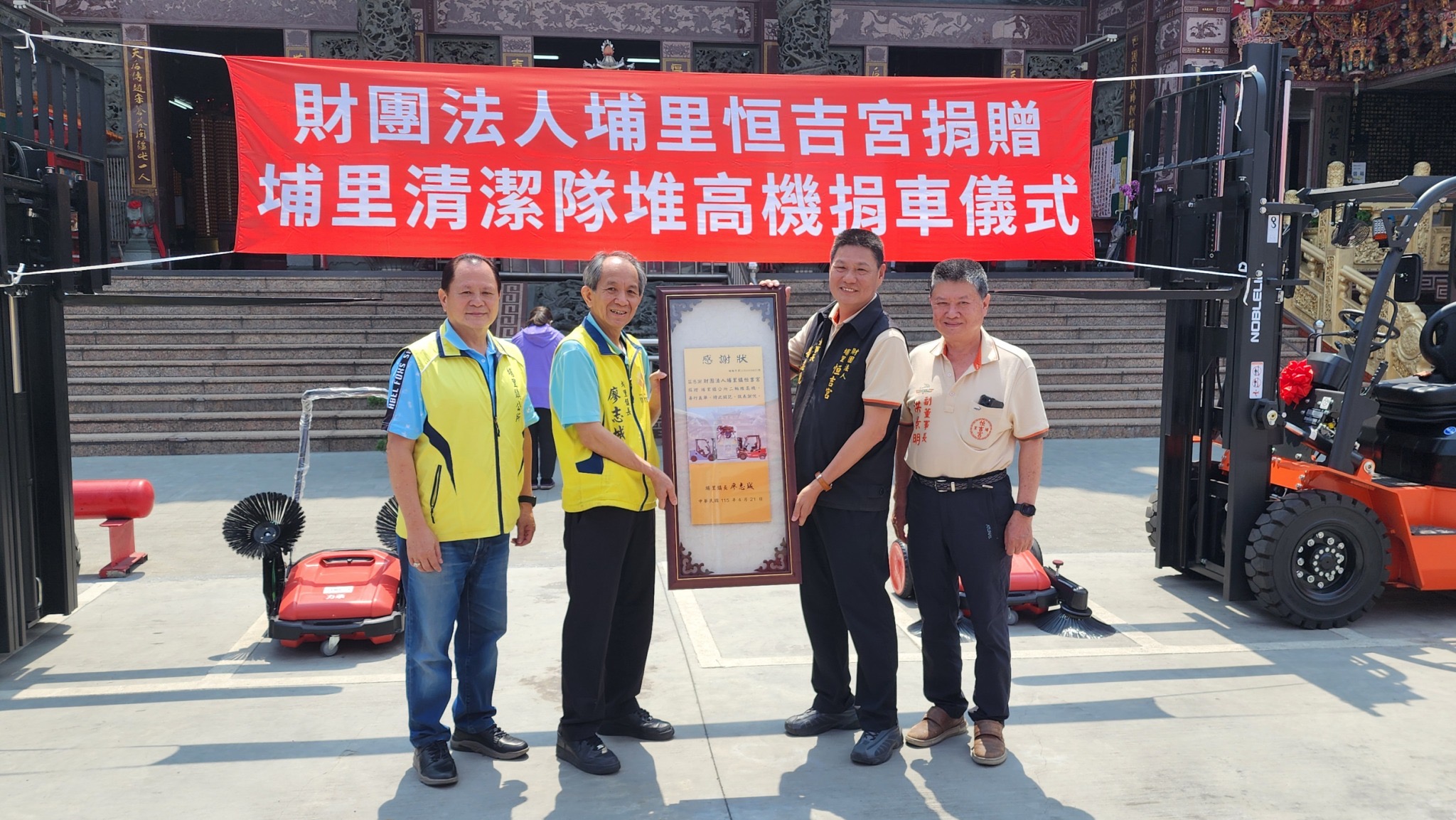 南投縣埔里鎮公所清潔隊現有堆高機老舊,經常「掛病號」罷工,難以負荷日益沉重回收作業,恒吉宮媽祖廟特別捐贈2台總價近110萬元的堆高機,以實際行動支持地方環境維護工作,今(21)日於媽祖廟前廣場舉行捐贈儀式,鎮長廖志城感恩媽祖慈悲,廟方長期支持地方建設與公共事務,尤其環保設備提升將大幅改善清潔隊工作效率與安全性,也呼籲鎮民共同珍惜環境,落實垃圾減量與分類,攜手打造乾淨美麗家園。