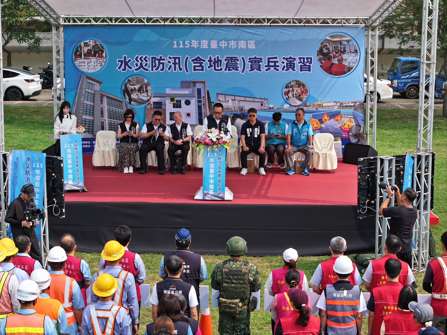 台灣即將進入梅雨及颱風季,為因應防汛準備,台中市南區公所於福田水資源回收中心辦理「115年度台中市南區水災防汛(含地震)實兵演習」,由台中市政府水利局總工程司廖健堯擔任演習統裁官,南區區長李美麗擔任指揮官,結合里長、國軍、各公民營單位、志工及防災士等團體演練,提升救災能量、熟悉災害應變搶救措施。