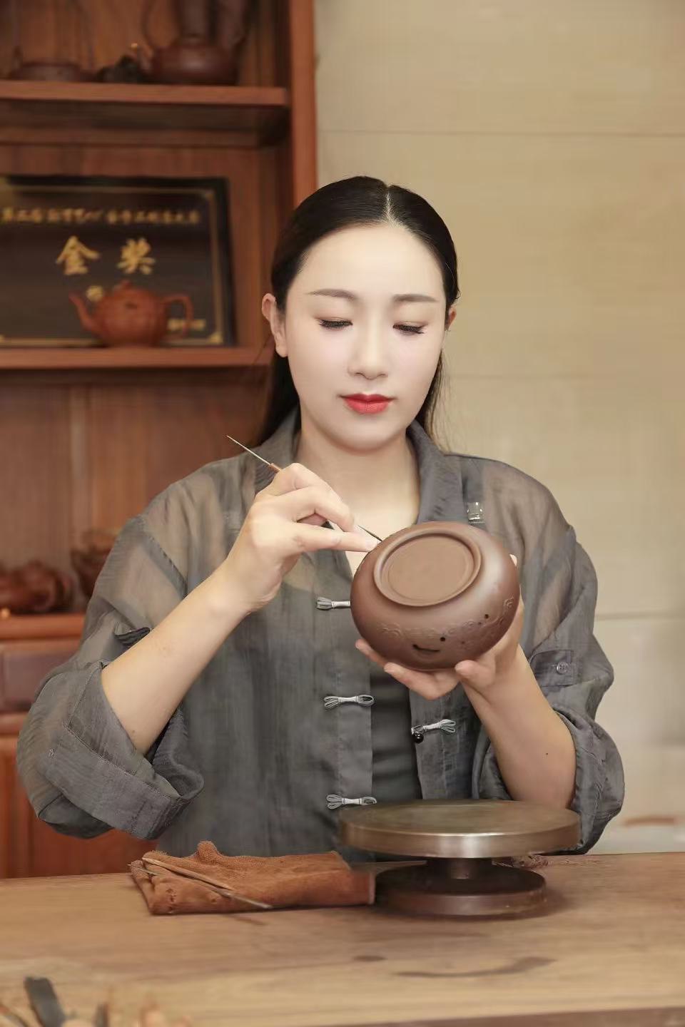 1990年代末,她正式進入紫砂二廠學習製壺,接受多位高級工藝美術師的指導,逐步建立紮實的基本功。在這段歲月中,她不僅學會如何控泥、塑形,更理解紫砂創作背後的精神內涵。她的師承脈絡源自顧景舟一系,由徐飛傳授技藝,延續傳統工法之精髓。
