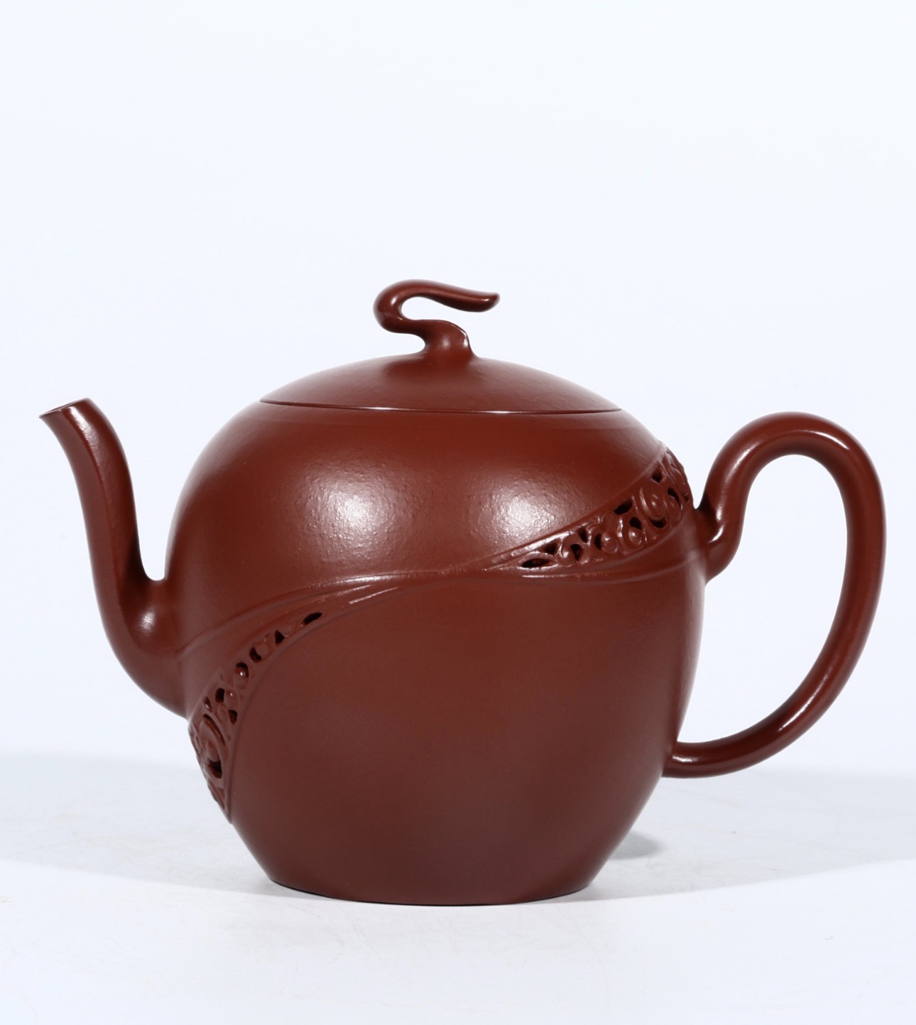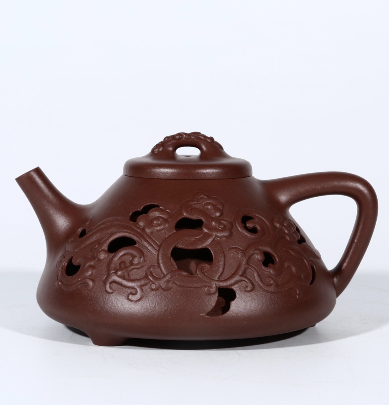 嵇芳最廣為人知的,是她在紫砂鏤空技藝上的突破。她將傳統壺體結構進行「破壞與重建」,在保持實用性的同時,創造出輕盈而富有層次的藝術效果。