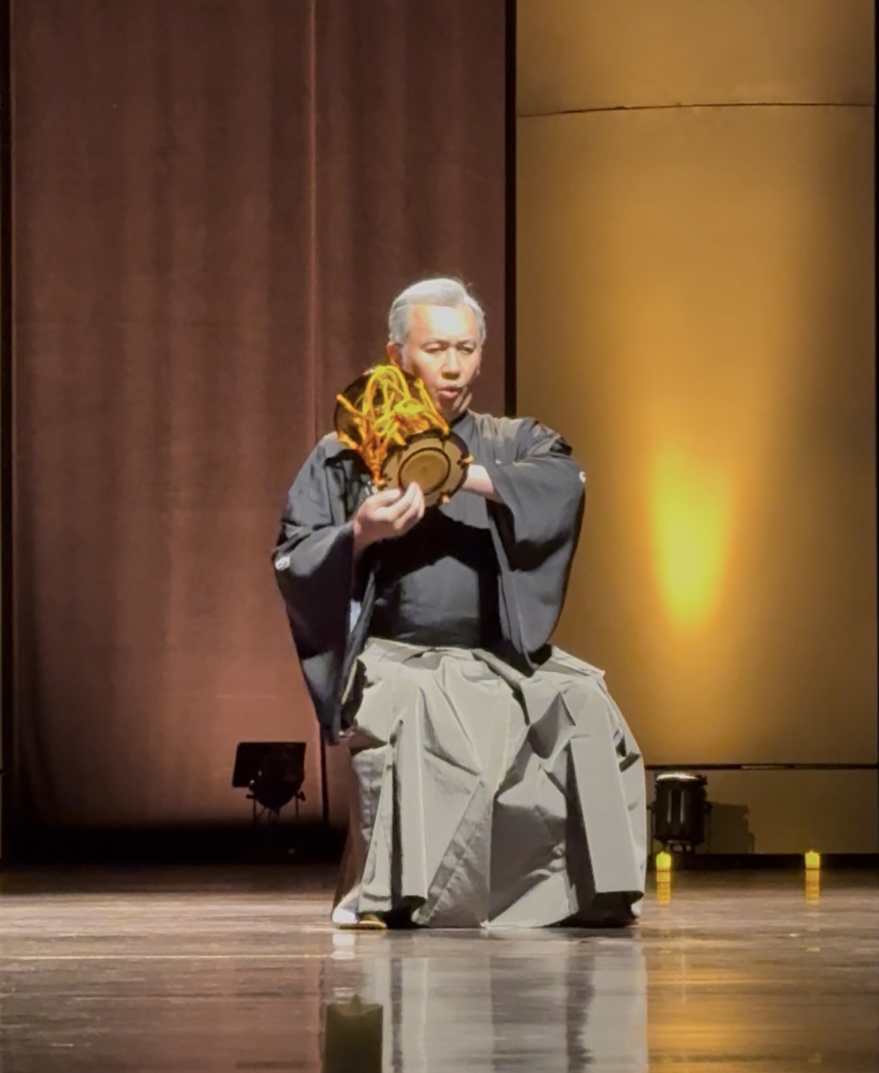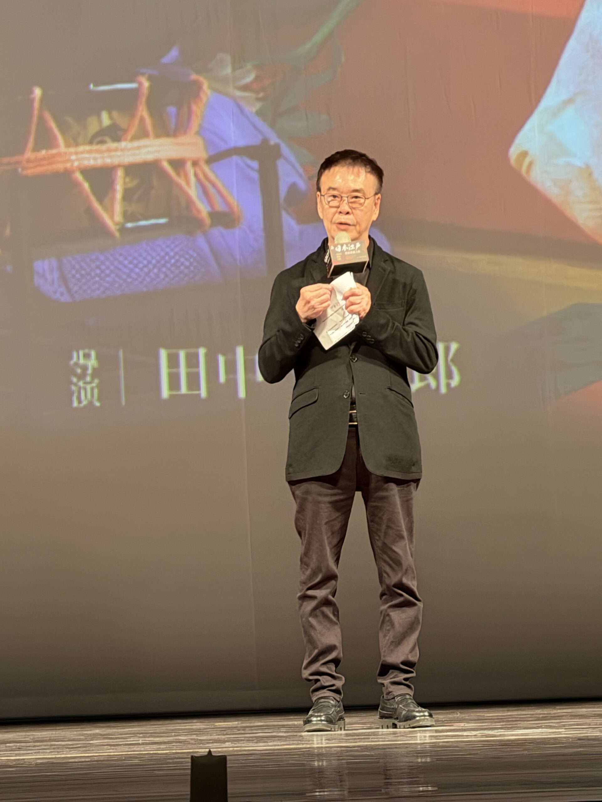今(4/23)演出前記者會上,導演田中傳次郎以一曲囃子獨奏音樂《三番叟》揭開序幕。小鼓聲沉穩而有力,展現其精湛小鼓技藝,亦為明日演出預先奏響氣韻。此曲源於能樂,為祈願天下太平、國泰民安的儀式性演出,同時向台灣與高雄獻上深切祝福。