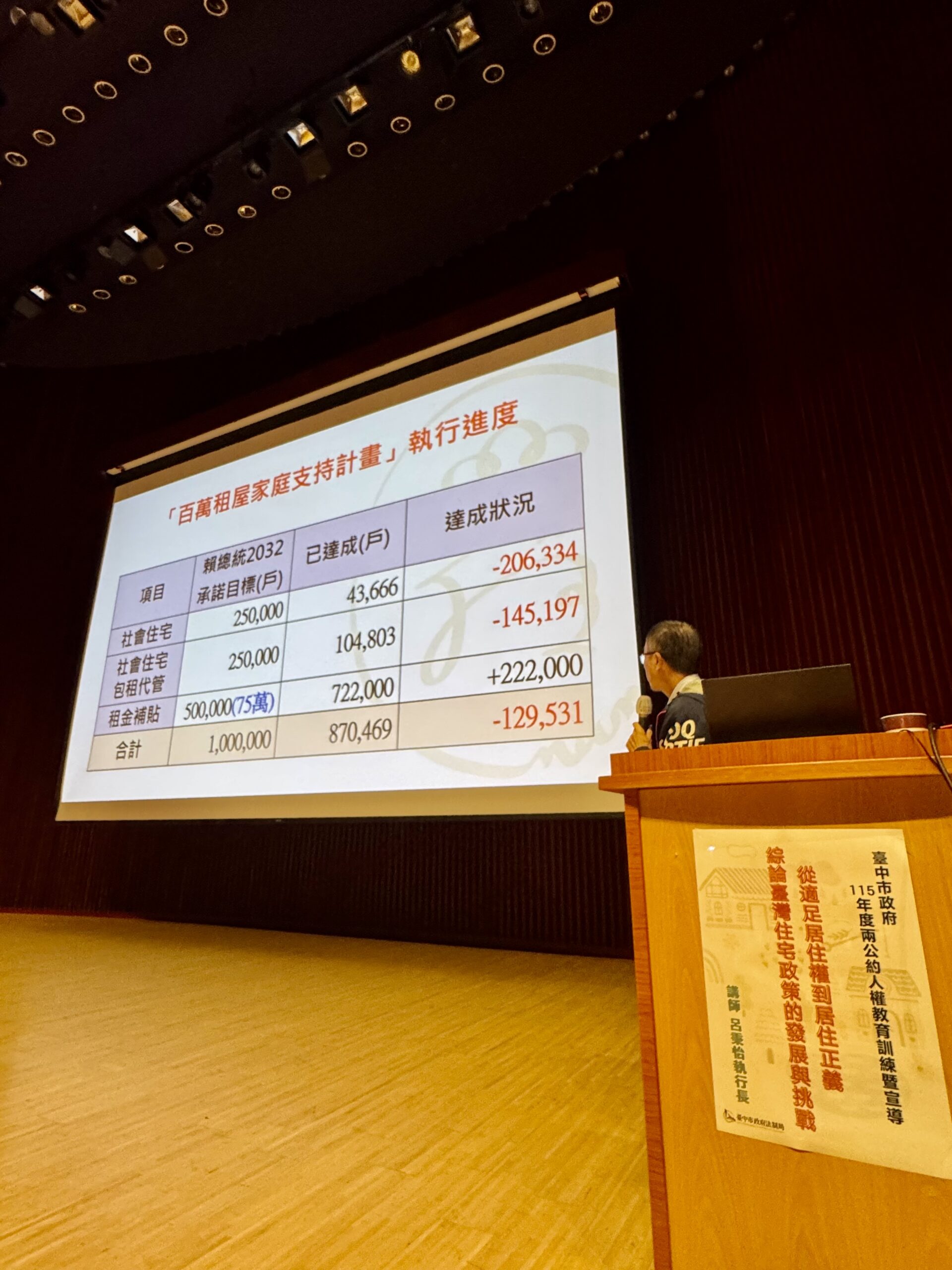台中市政府於昨(22)日舉辦兩公約人權教育訓練暨宣導課程,此次以「從適足居住權到居住正義:綜論台灣住宅政策的轉型與挑戰」為主題,邀請崔媽媽基金會執行長呂秉怡擔任講師,帶領市府同仁從國際人權公約出發,探討我國住宅政策發展與居住正義相關議題。