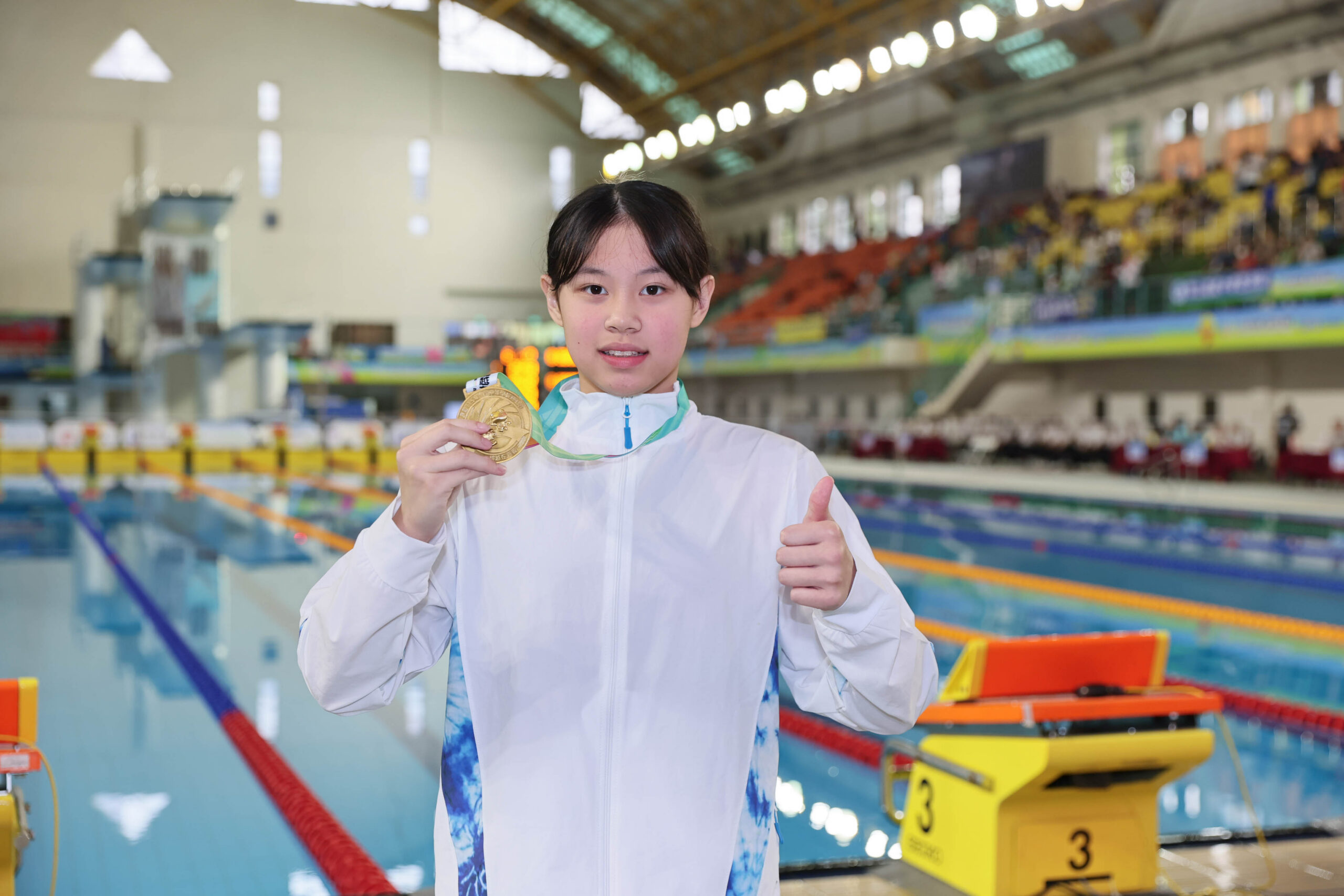 游泳國女組50公尺蝶式福和國中李姵璇奪金28秒19並破大會紀錄。(新北市體育局提供)