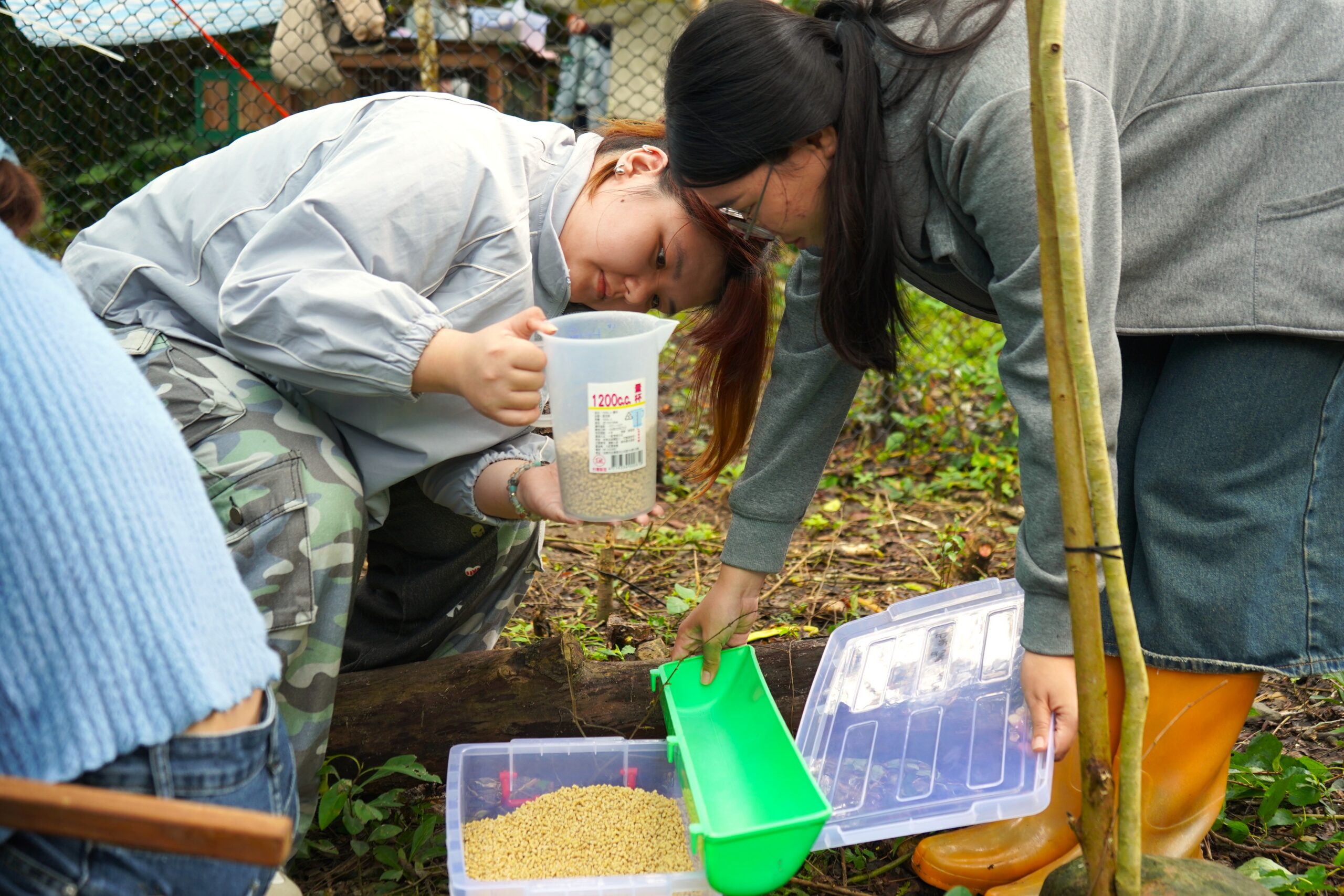 回到課程本身「養雞」的的重頭戲,2026年4月8日上午,大學生與「雞老師」的初次接觸~雞老師搬家到東華囉,起初現場氣氛多半是既興奮又有些不知所措,但在業師的專業指導下,學生們學會用雙手輕柔地托住雞隻的底部與雙翅、穩穩護住重心,第一次真切體會到小生命傳遞過來的溫暖與柔軟。為了幫助這群新嬌客度過轉換環境的適應期,同學們隨即分工合作,著手準備第一餐並替飲水加入電解質來安撫牠們的情緒。隨著雞群逐漸放鬆警戒,開始在舍內悠哉散步、自在啄食,學生們原先的忐忑也隨之消散;在專注照顧的過程中,大家自然而然地沉浸於這份與動物相伴的寧靜,深刻感受到生命帶來的溫馨與療癒力量。