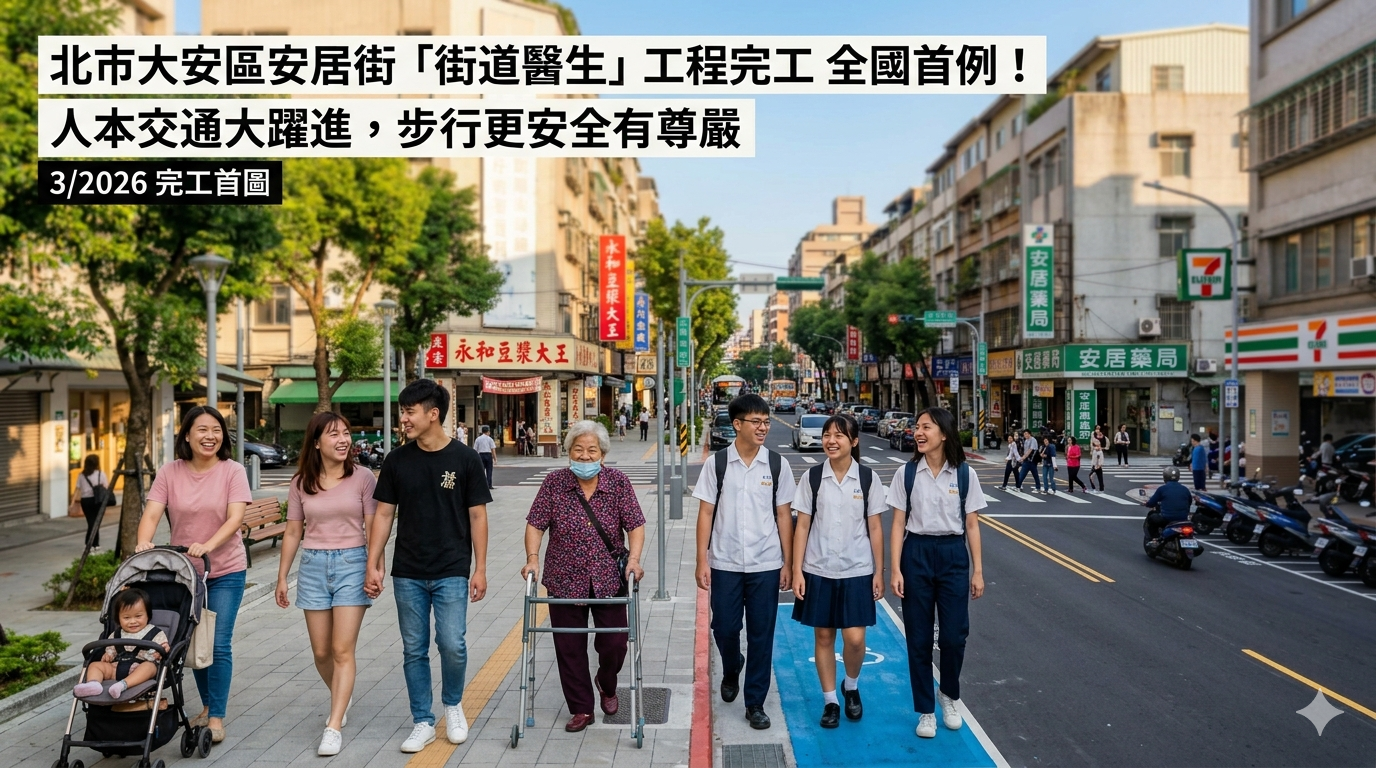 臺北市大安區安居街人行空間改造於115年3月完工,成為全國首件「街道醫生」完成案例。本案由臺北市政府交通局與工務局新建工程處共同推動,於道路兩側設置約1.5公尺人行道,新增約2,000平方公尺人行空間及31處行人穿越線,並同步優化停車與臨停機能,機車停車格由138格增加至166格,並新增1處共用臨停區,提供24小時貨車、計程車、復康巴士及長照車輛臨停使用;經實地測量,在路寬適度縮減下,整體行車時間仍維持穩定,有效兼顧通行效率與行人安全,居民整體滿意度達7成以上,展現人本交通政策具體成果。