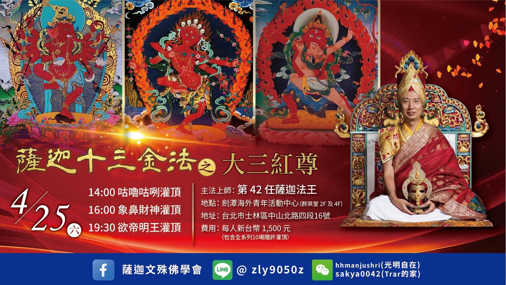 此次第42任薩迦法王慈悲應允,將於灌頂首日4/25中親授十三金法中極具代表性的「大三紅尊」隨許灌頂,包括咕嚕咕咧佛母、象鼻財神與欲帝明王三尊本尊,象徵懷攝、除障與增財三大修法功德。