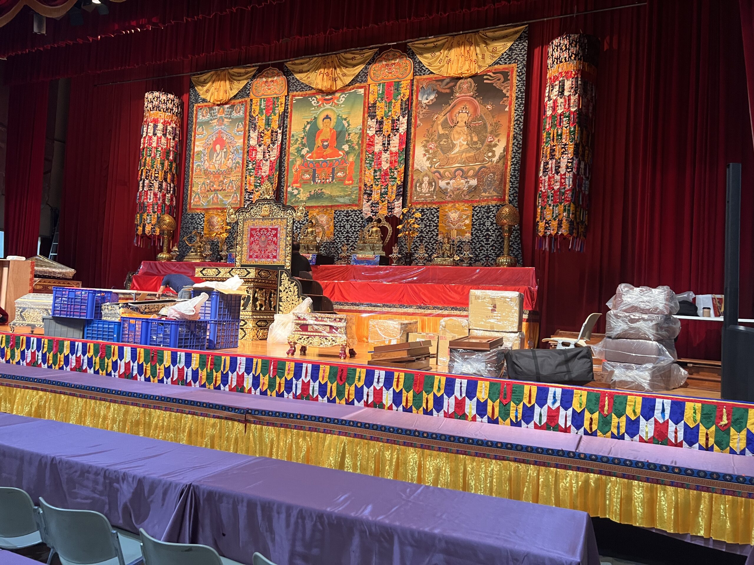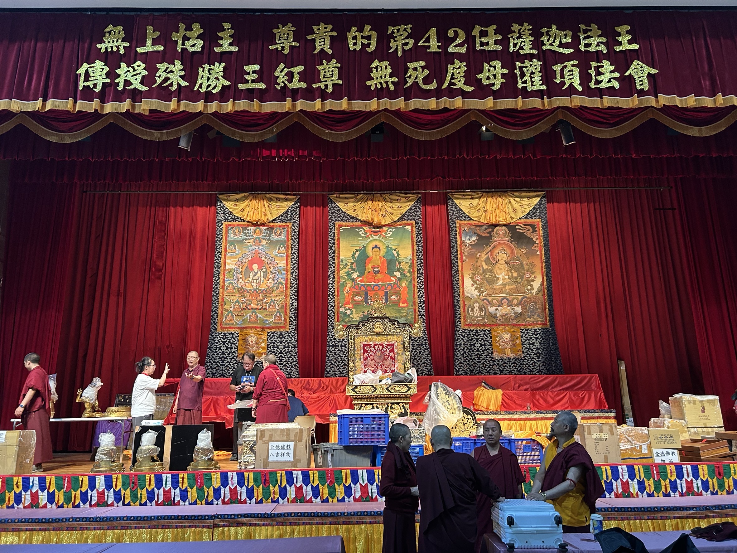 劍潭活動中心的場地佈置,工作人員準備就緒恭迎4/25 薩迦法王親臨會場主持盛大法會。/ 圖 游宏琦 攝