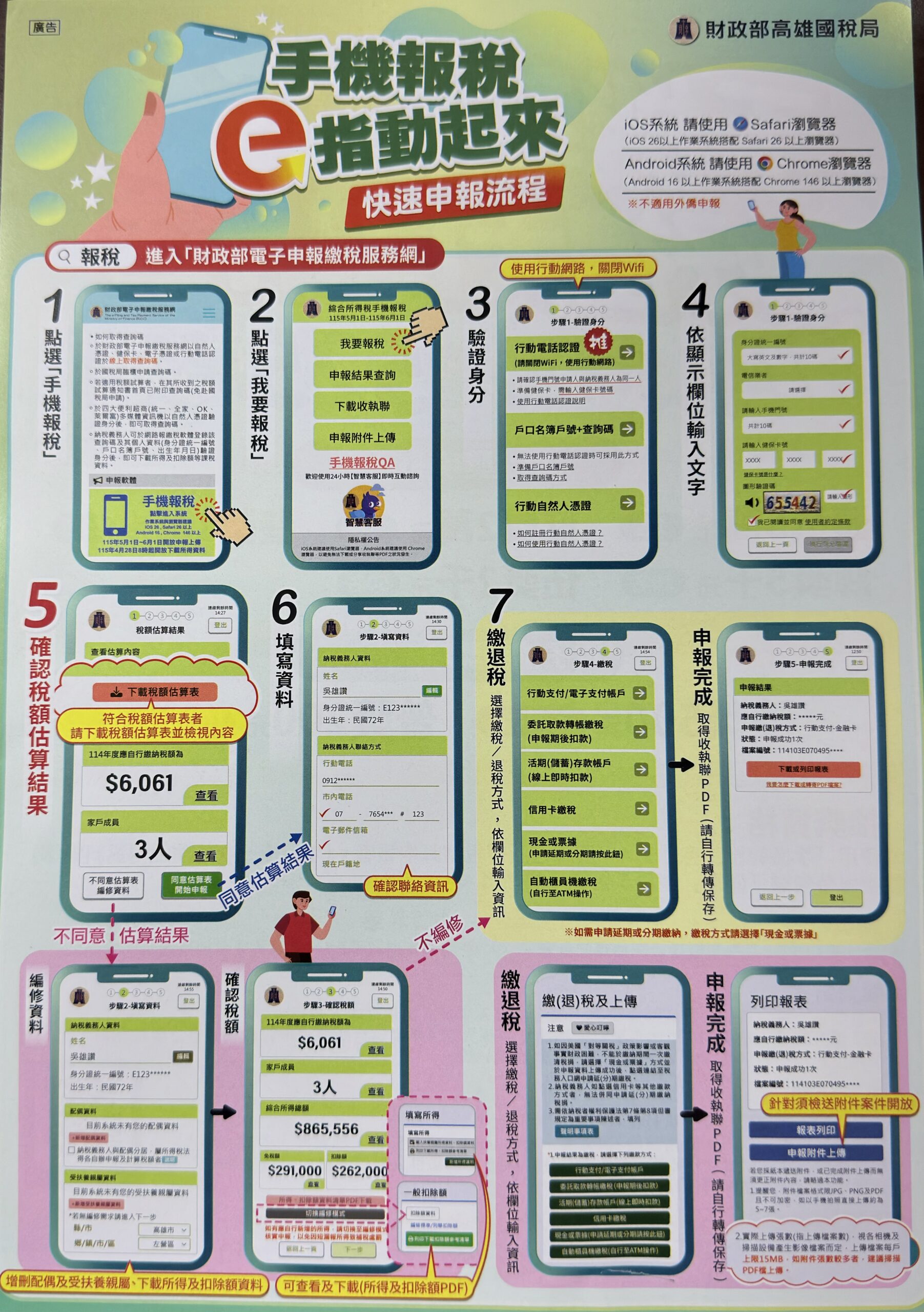 5月1日至5月3日為勞動節及週休二日共3天連假,各地區國稅局不提供臨櫃報稅服務。建議民眾可多加利用手機報稅或線上版報稅系統搭配「稅額估算表快速申報流程」報稅,只需5個操作步驟:①