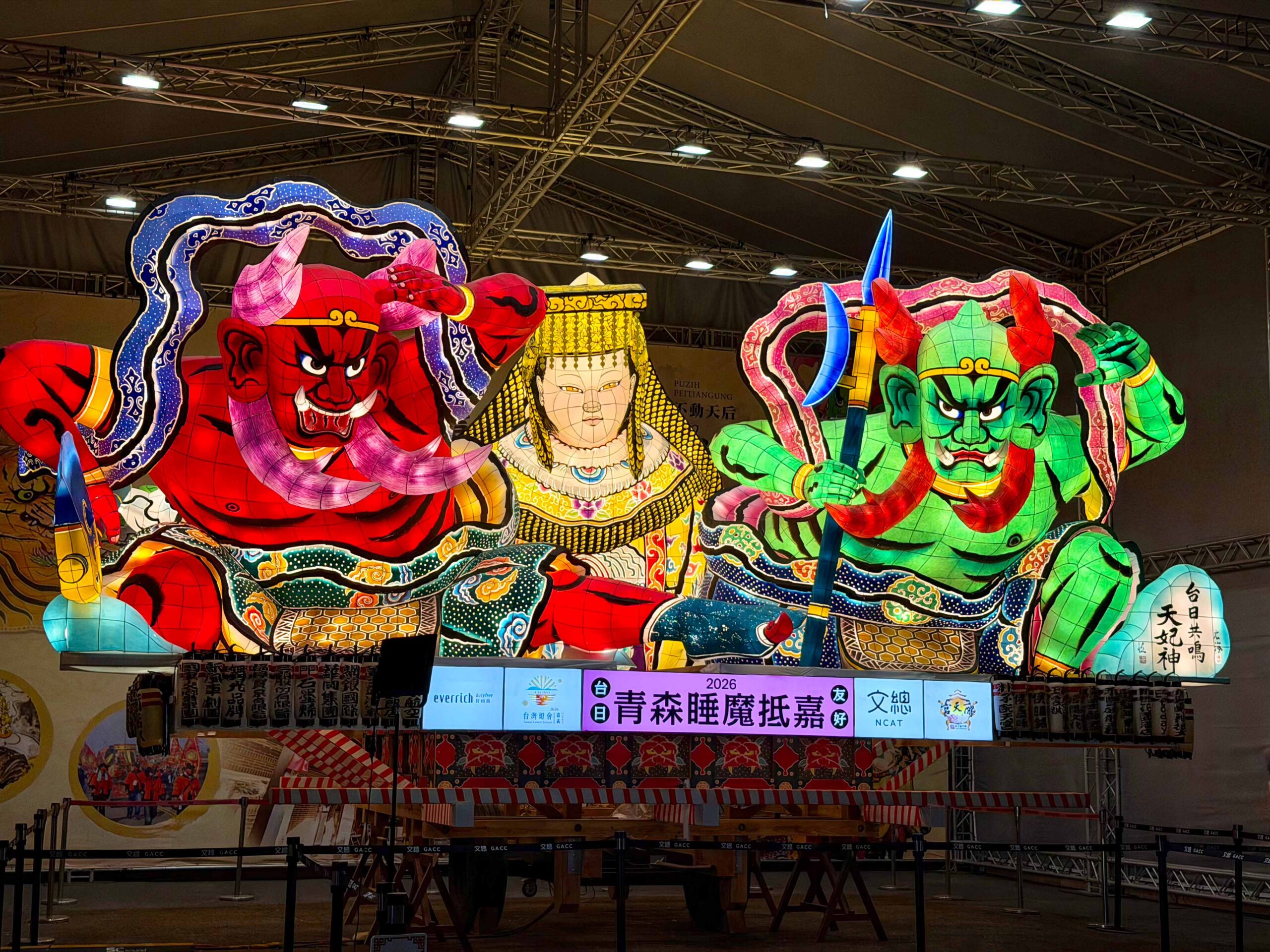 目前於朴子配天宮展出的青森睡魔以「樸仔媽」媽祖、千里眼、順風耳及虎爺為發想,融合台日文化元素,呈現氣勢十足的燈藝作品,展期至5月10日,現已進入最後展期尾聲,夜間點燈後更顯璀璨吸睛,是近期不可錯過的亮點活動。