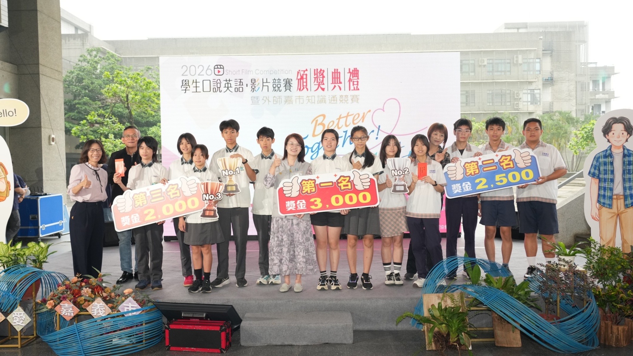 嘉義市政府今(25)日上午於國立嘉義大學新民校區管理學院穿堂舉辦「2026學生口說英語影片競賽暨嘉市知識通頒獎典禮」,現場氣氛熱烈。今年以「Better Together! 幸福嘉義,+1 共好!」為主題,號召全市學生活用市訂雙語教材《Chiayi Adventures》,並首度舉辦外籍教師中文競賽,呈現「學生說英語、外師說中文」的雙向交流,展現嘉義市推動「教育新世代」旗艦計畫的豐碩成果。