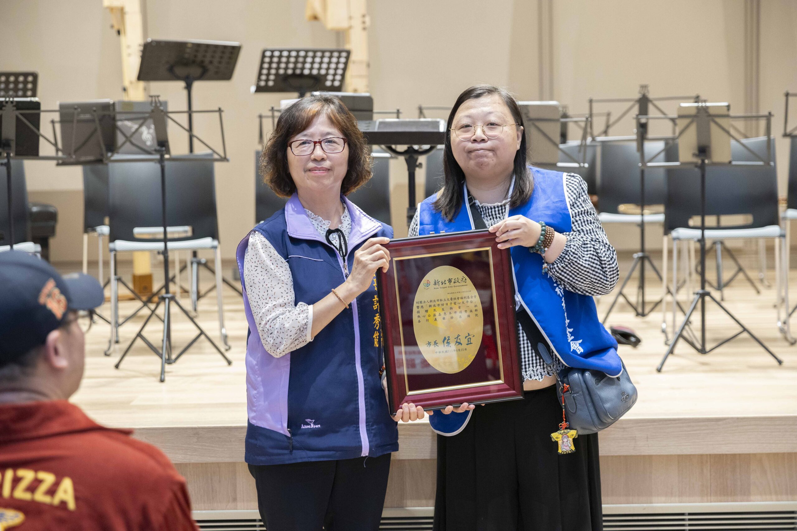 社會局副局長許秀能代表侯友宜市長,回贈感謝牌給財團法人新北市私立文豪社會福利基金會代表林映如(右)。(新北市社會局提供)
