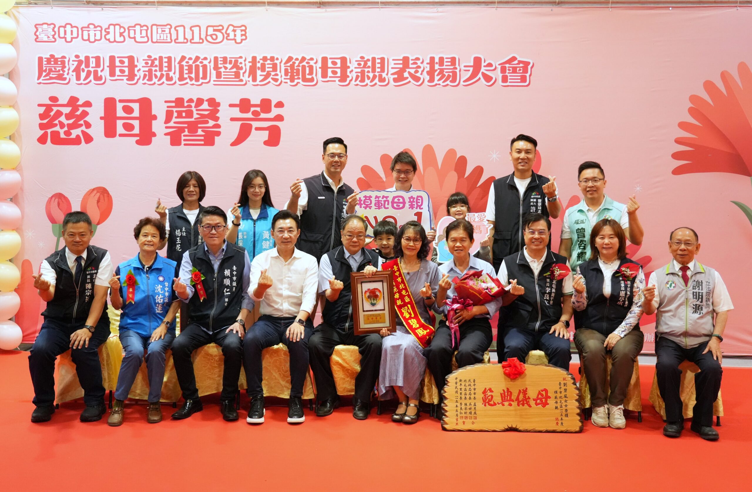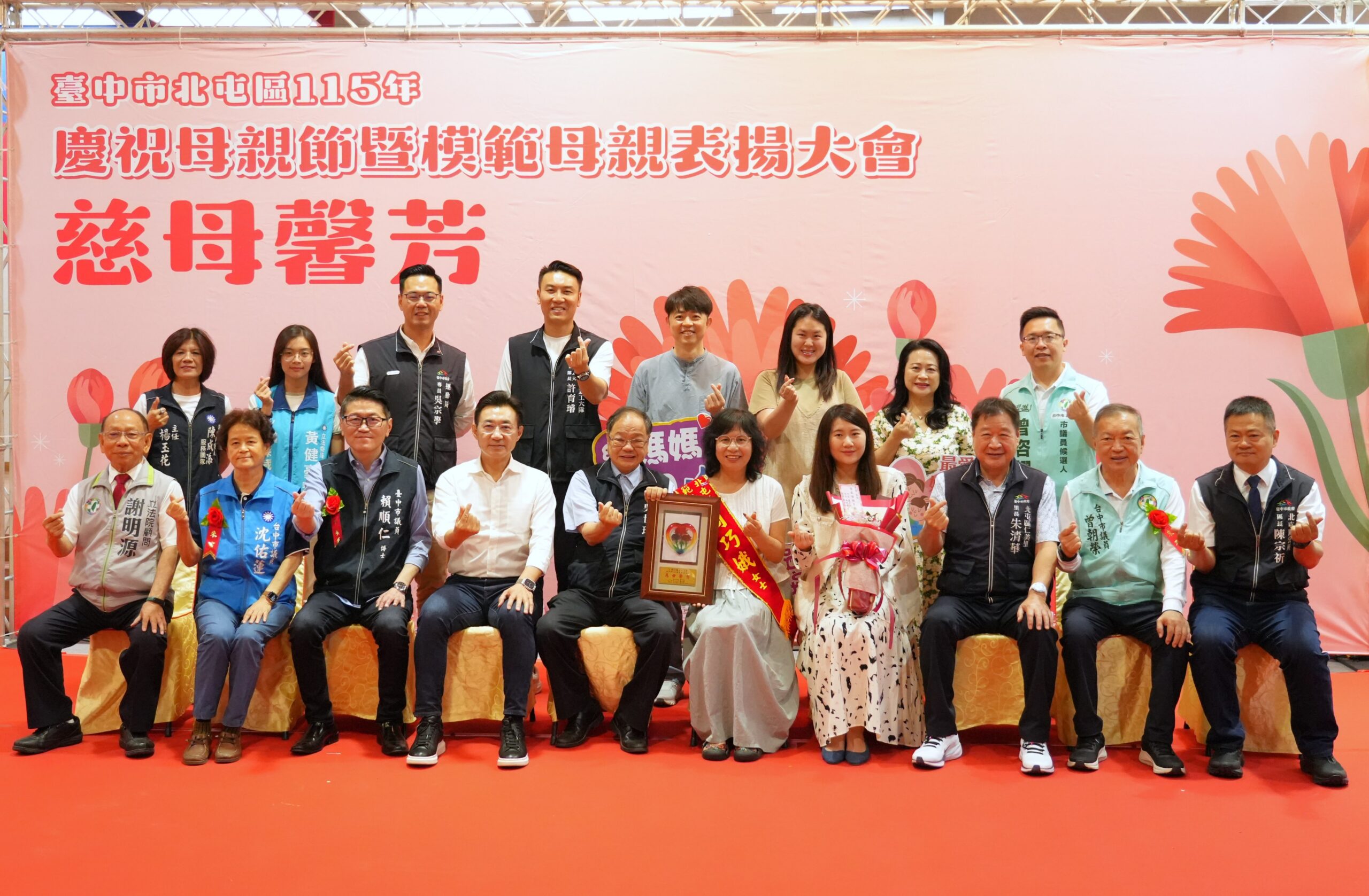 溫馨母親節將至,台中市北屯區公所今(26)日於公所6樓大禮堂舉辦「115年度台中市慶祝母親節暨模範母親表揚活動」,54位模範母親在子女、孫輩陪同下出席受獎並合影,感受溫馨光榮的一刻。台中市政府民政局長吳世瑋代表市長盧秀燕頒發「慈母馨芳」獎牌,向所有辛勞偉大的母親致上最深敬意,感謝她們長年為家庭無私奉獻,並祝福全天下媽媽母親節快樂、幸福安康。