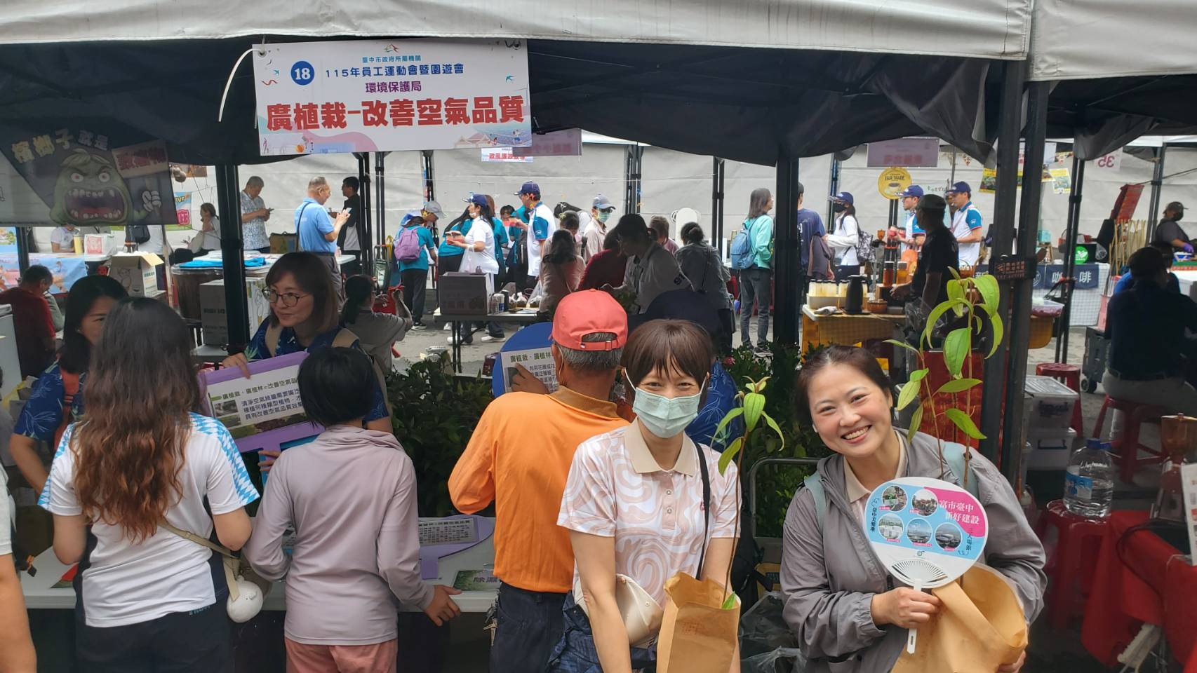 為提升市民對空氣品質改善及城市綠化的重視,台中市政府環保局於昨(25)日「台中市政府所屬機關115年員工運動會暨園遊會」活動中,設置「廣植栽-改善空氣品質」攤位進行宣導,積極推廣「廣植栽、廣植林」行動,此次活動總共提供500株植栽,採有獎徵答方式進行宣導並贈送限量植栽,現場人潮絡繹不絕,活動尚未結束即發放完畢,成為活動最具人氣攤位之一。