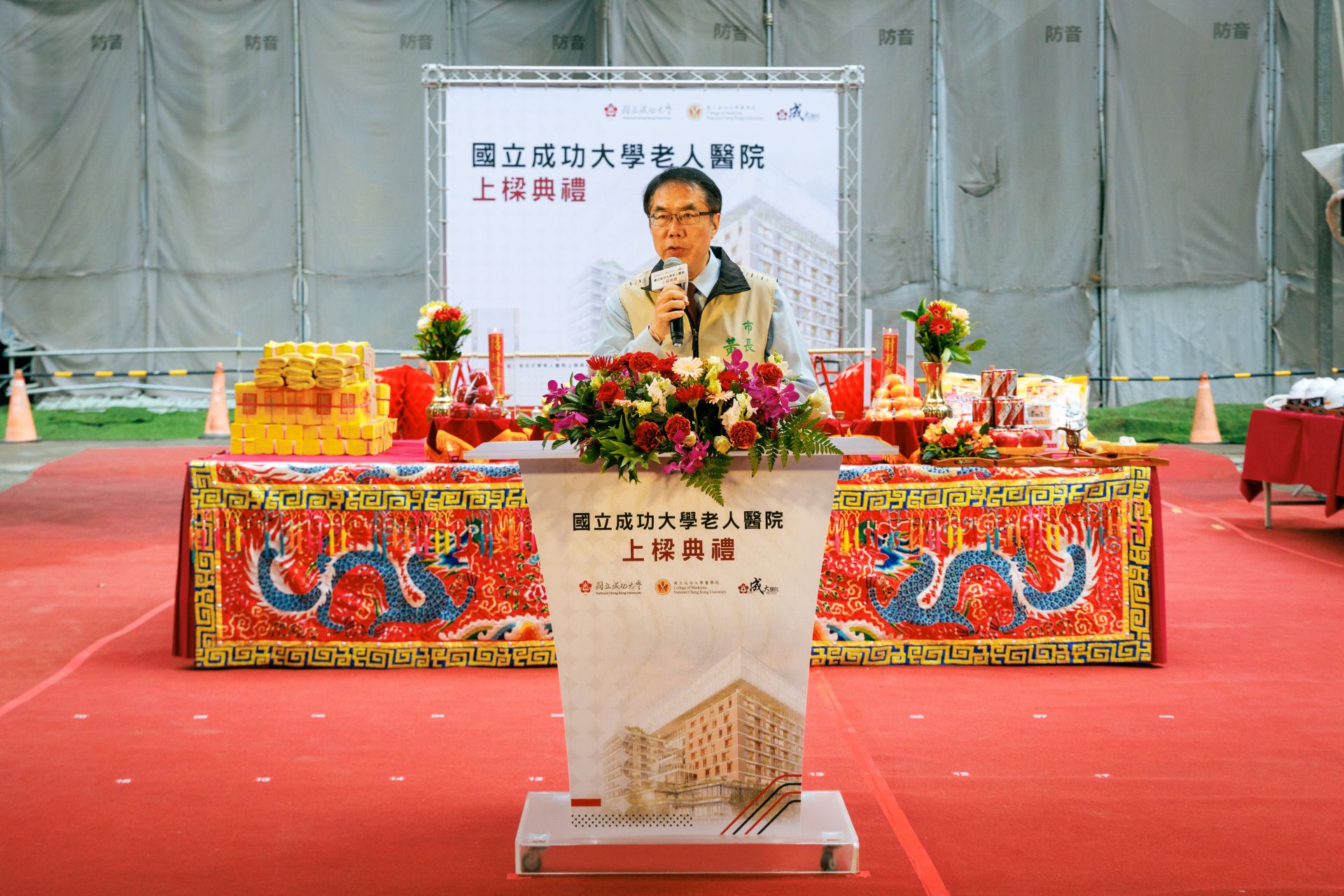 上樑典禮簡單隆重,臺南市長黃偉哲、成大校長沈孟儒、醫學院院長鄭修琦、醫學院附設醫院院長李經維、前醫學院院長張俊彥、前附設醫院院長楊俊佑、總統府資政韓良誠、中華民國醫師公會全國聯合會理事長陳相國、立法委員林俊憲、陳亭妃等重要貴賓齊聚見證,共同完成上香祝禱與鋼樑簽名等儀式,伴隨樂聲與禮炮齊鳴,將置於建築最高處的鋼樑穩穩地上升至安放處,象徵著老人醫院工程邁向最後完工階段。