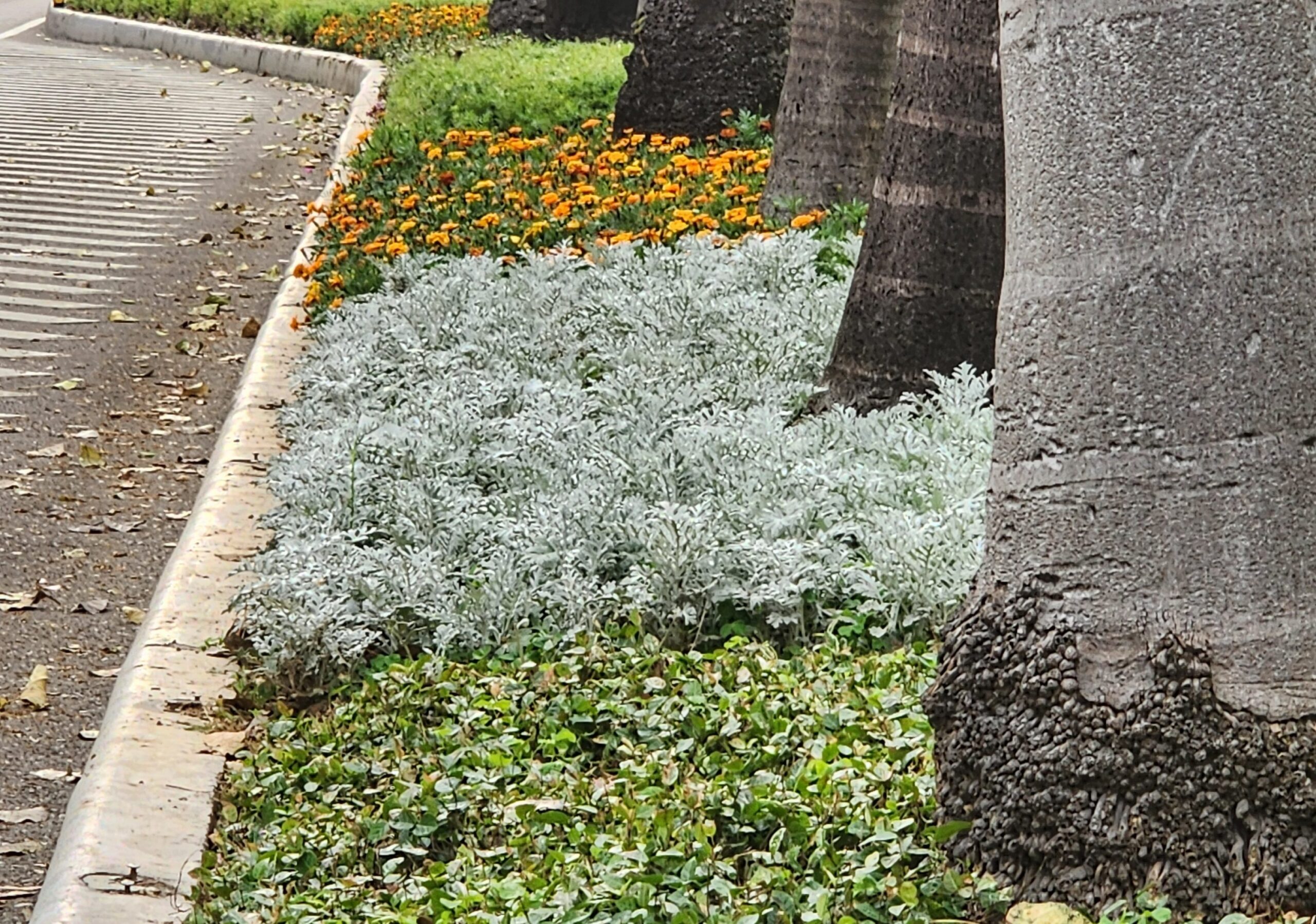 公園處表示,這季的草花配置以銀葉菊及五彩石竹為主要視覺基調。銀葉菊以其細緻柔軟的銀白色葉片,呈現出低調而優雅的質感,在陽光照射下泛出淡淡光澤,為整體景觀鋪陳出清新明亮的底色;五彩石竹則以紅、粉、白等多樣花色點綴其中,花形精巧且開花整齊,形成活潑且富節奏感的色彩律動。兩者相互搭配,營造出冷暖色調交織的視覺層次,使仁愛路沿線在行車與步行視角中皆呈現豐富且連續的景觀變化。另亦搭配季節性強、色彩鮮明的孔雀草,作為局部重點區段的亮點植栽。孔雀草為花色橙黃的暖色系,花朵飽滿且具有強烈的視覺吸引力,在分隔島節點或轉角處形成醒目的色塊配置,不僅強化道路節奏感,也提升用路人對空間節點的辨識度。