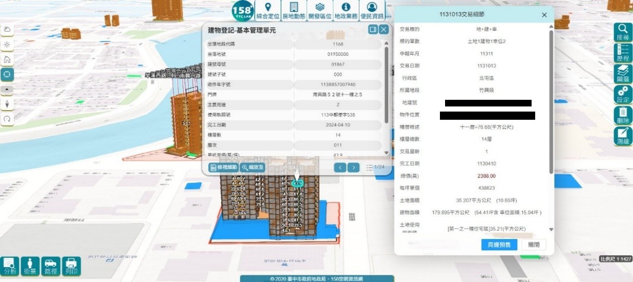 地政局長曾國鈞指出,過去市民查詢實價登錄或產權資訊時,僅能依賴2D平面圖資,面對高樓大廈或結構複雜的建物時,往往難以精確想像空間位置,現在透過158PLUS空間資訊網,市民只需輕點螢幕,即可透過立體視角查看特定樓層的面積、產權範圍及實價登錄資訊,落實「所見即所得」的資訊透明化環境。