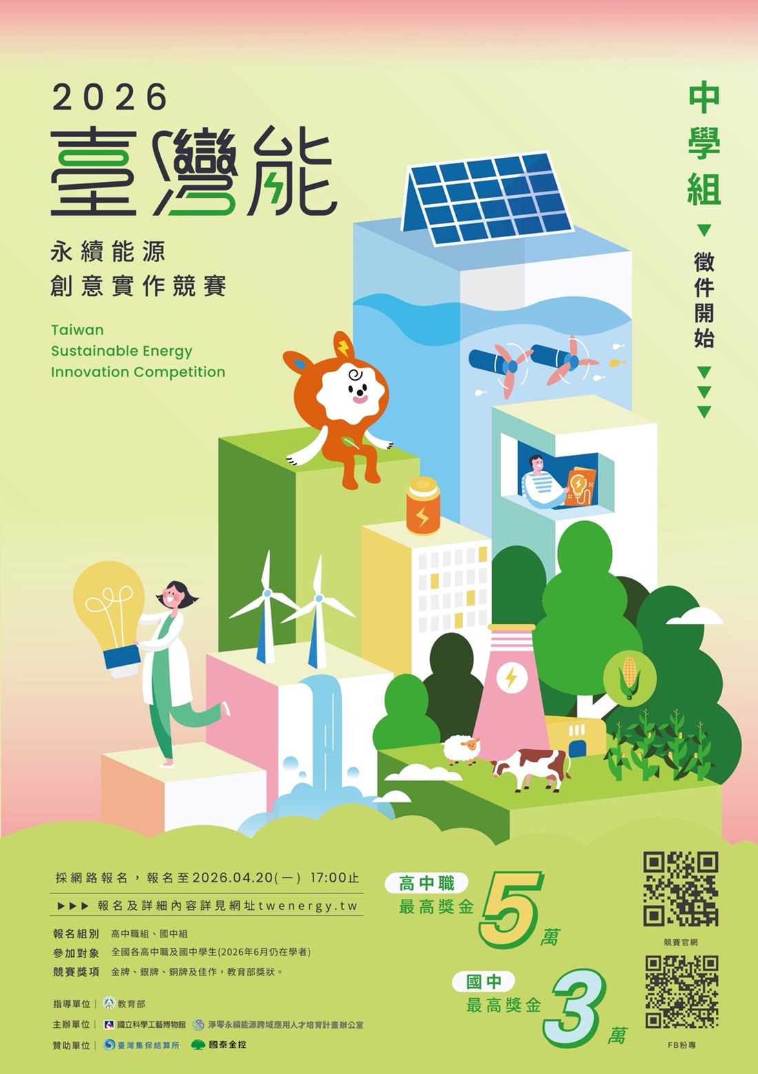 由教育部指導,國立科學工藝博物館與淨零永續能源跨域應用人才培育辦公室共同主辦之「2026臺灣『能』—永續能源創意實作競賽」即日起開放報名中,誠摯邀請全國國中、高中職及大專校院學生踴躍參與,共同投入能源創新行動。