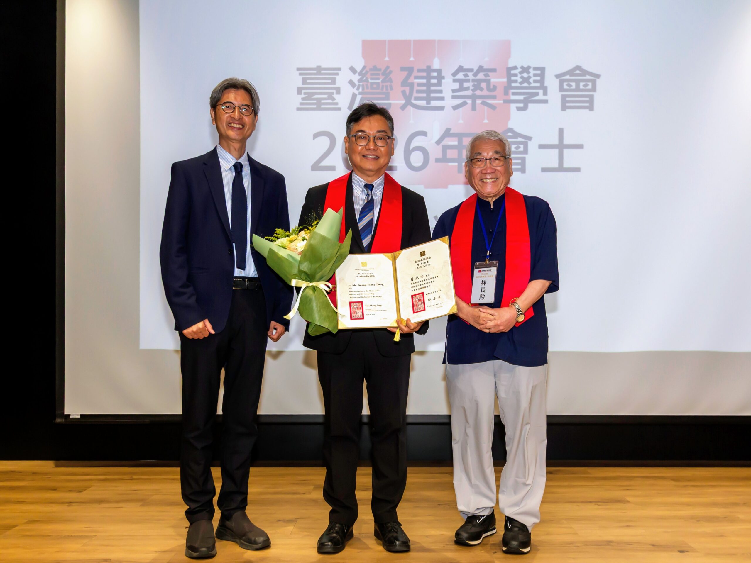 臺灣建築學會會員代表大會,中原大學曾光宗(中)與理事長鄭泰昇(左)、「會士會」會長林長勲(右)合影。