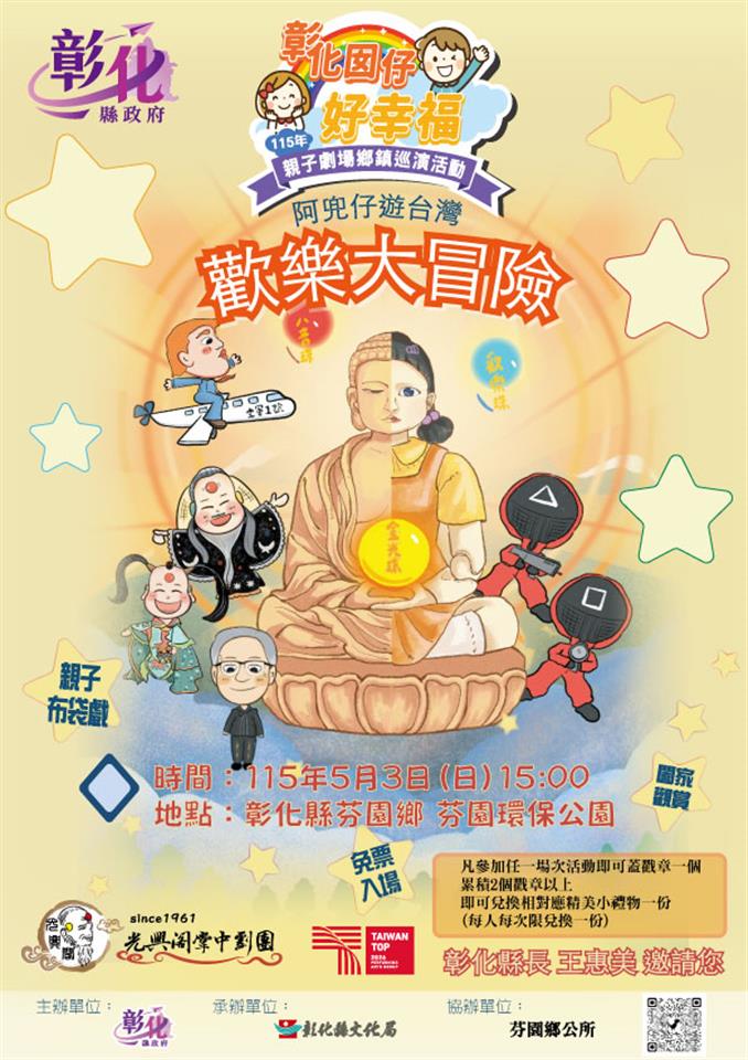延續4月的歡笑,「彰化囡仔好幸福—115年親子劇場鄉鎮巡演活動」將持續帶來精采豐富的演出,陪伴大小朋友走進藝術世界,在歡樂與感動中獲得啟發。將於5月2日下午3點在田尾國小活動中心及5月3日下午3點在芬園環保公園熱鬧開演,歡迎闔家共賞!