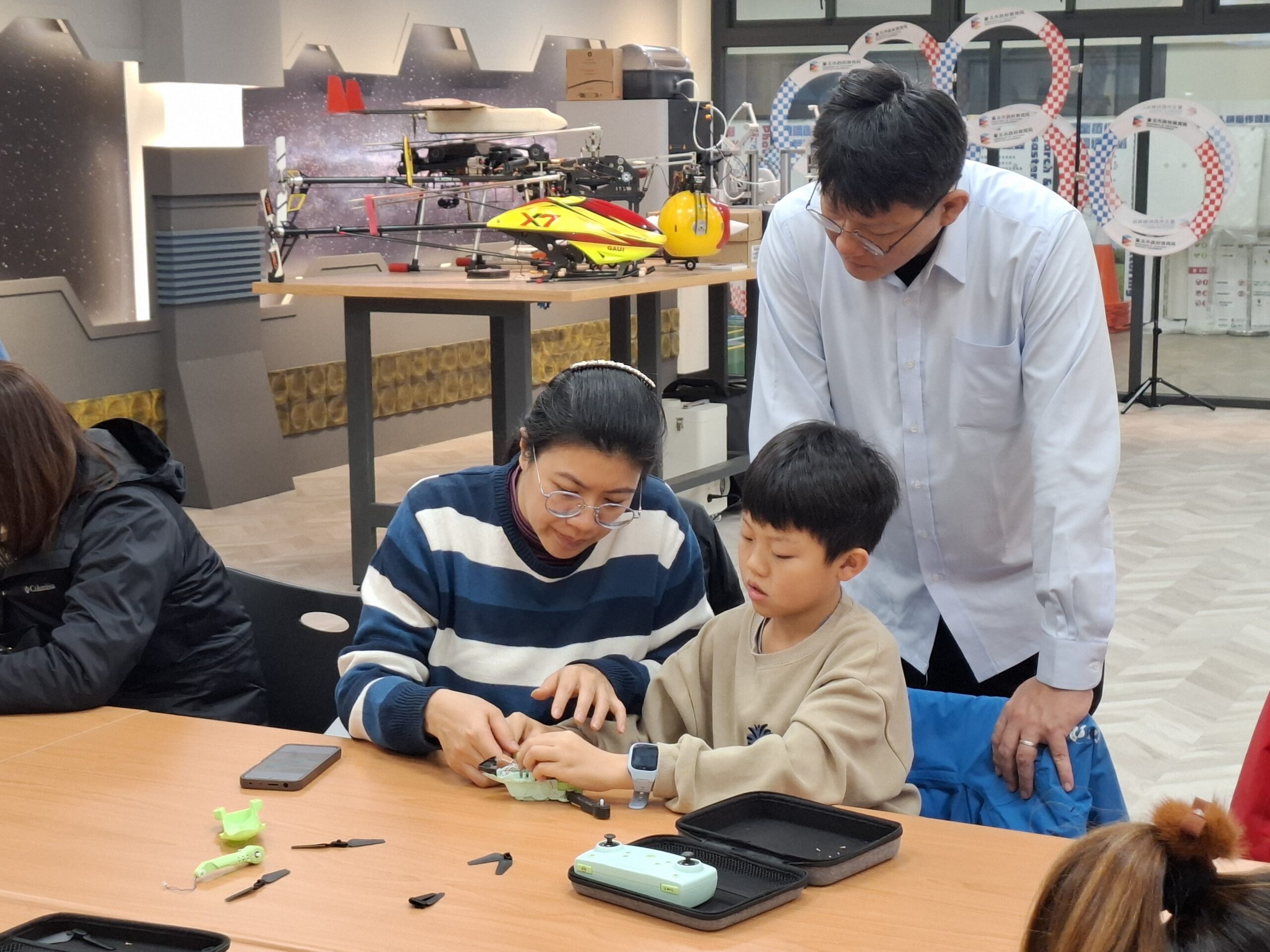 營隊亦規劃FPV沉浸式飛行體驗、足球無人機競技、空拍影像應用剪輯,以及無人機DIY組裝等主題,逐步引導學生由無人機組裝、飛行,再延伸至AI應用與影像創作,實踐「做中學、用中學」教學理念。此外,營隊設有親子共學課程,促進家庭共學無人機知能,並提供經濟弱勢學生優先錄取及免收費用措施,擴大無人機教育參與機會。