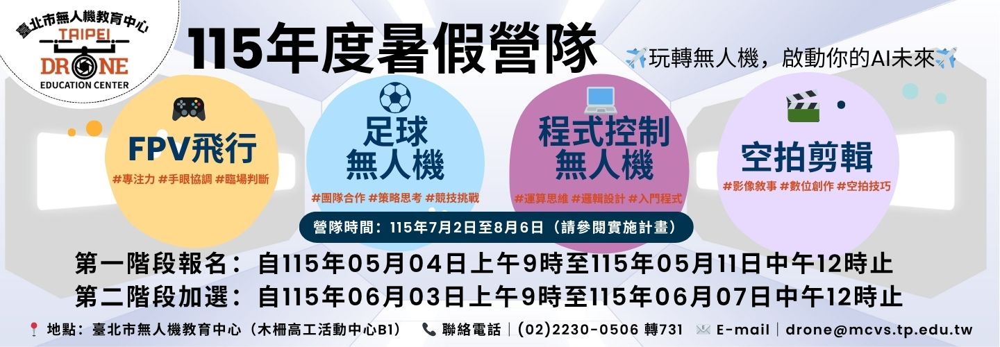 隨著無人機技術在產業發展、教育及日常生活中運用愈發普及,臺北市政府教育局為深化學生認識無人機多元應用,臺北市無人機教育中心於115年暑假7月2日(星期四)至8月6日(星期四),辦理高達25梯次「無人機暑期營隊」,主題涵蓋首次登場「程控無人機」,以及「FPV飛行體驗」、「足球無人機」、「無人機空拍剪輯」、「無人機DIY」等, 營隊自5月4日(星期一)上午9時起開放報名,有意願參與者把握機會!