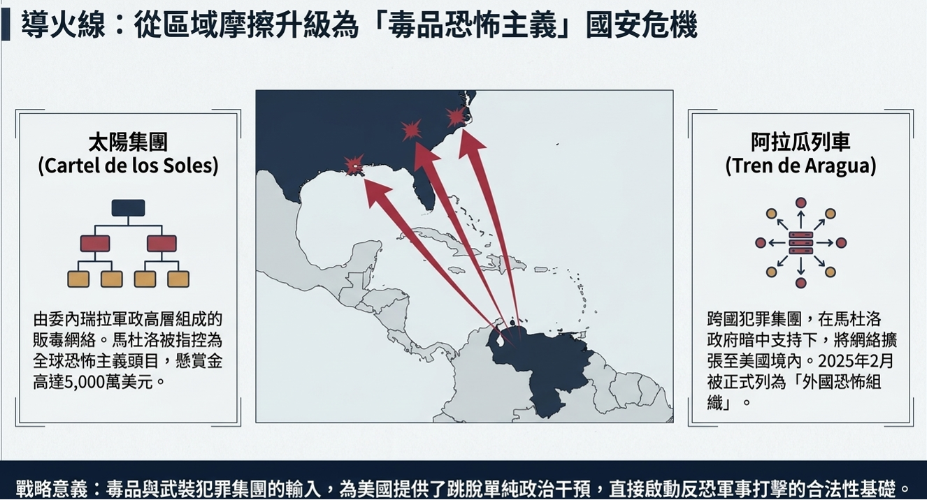 根據亞洲《南華早報》的背景分析,2026年川普第二任總統任期,美國戰爭部部長皮特•赫格塞斯(Pete Hegseth)由川普總統授權,自2025年11月起便在西半球加勒比海域展開「南方之矛行動」(Operation Southern Spear),以攔截委內瑞拉運毒船為名進行兵力集結 ,實則為針對卡拉卡斯(Caracas)的定點清除與政權更迭做準備。美國川普總統明確指出此運毒恐怖組織將毒品輸入美國境內,此舉為