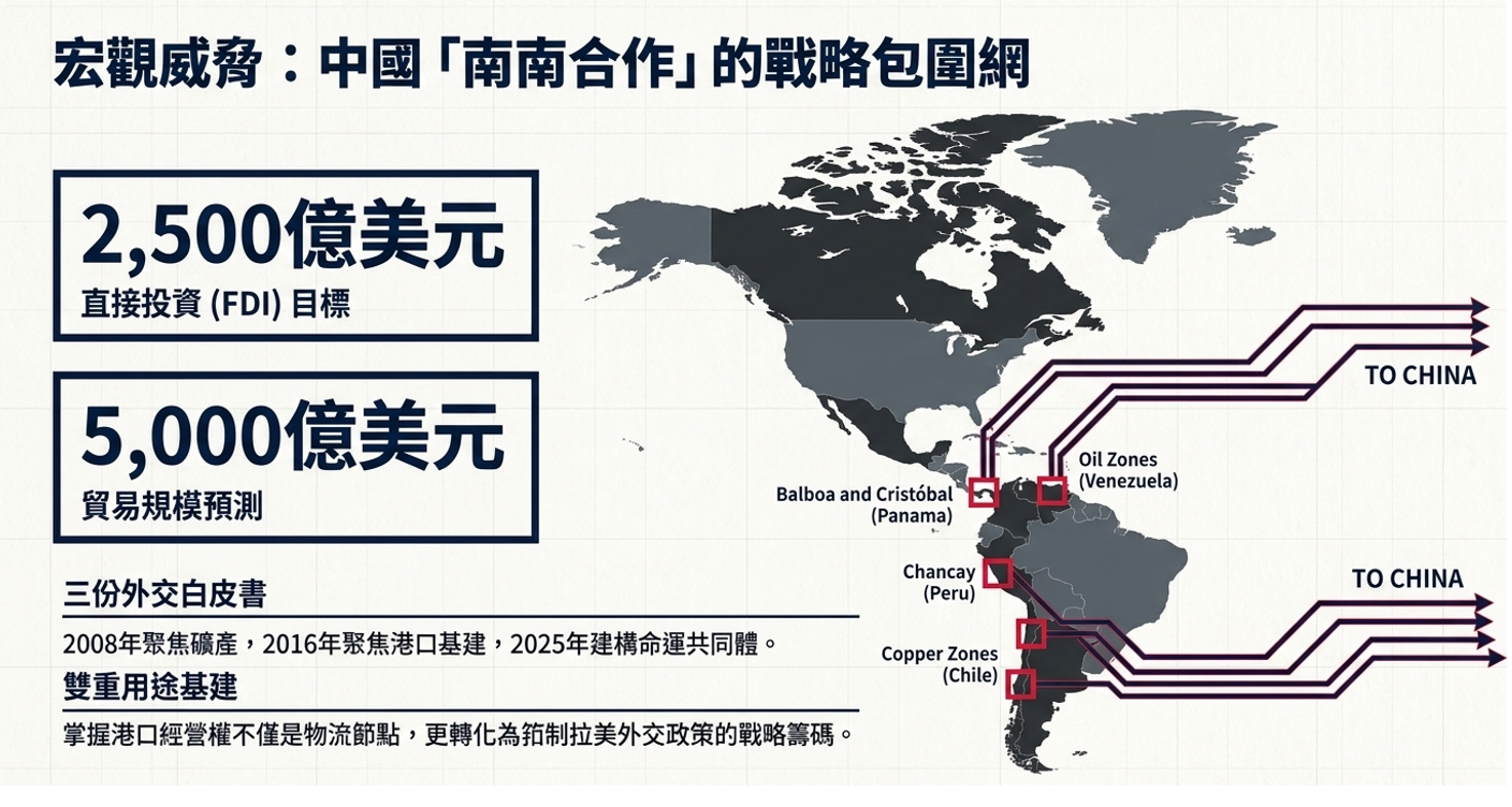 中國在拉丁美洲的影響模式主要透過經濟投資與商業合作展開,第一版拉丁美洲外交白皮書著重於中國國營企業天然資源與礦產的投資,符合中國崛起所需之戰略物資,第二版拉丁美洲外交白皮書與一代一路計畫中國著重於基礎建設與港口設施的投資,於拉丁美洲具代表性的投資就是巴拿馬運河的太平洋巴爾博亞(Balboa)港口與大西洋克里斯托瓦爾(Cristóbal)港口維運與建設秘魯錢凱大型港口,中國兩份拉丁美洲外交白皮書都指出委內瑞拉都是石油天然資源重要的進口國家。同時中國企業在拉丁美洲港口的參與港口經營權,以雙邊投資或合資形式進行,並配合能源與貿易相互合作。此種模式表面上避免直接涉入安全或軍事事務,卻在實務上中國掌握拉美國家供應鏈與對外貿易重要據點。依照長期戰略考量,港口不僅成為貨物流通的節點,也可能轉化為影響拉美國家對於政策選擇與外交籌碼。