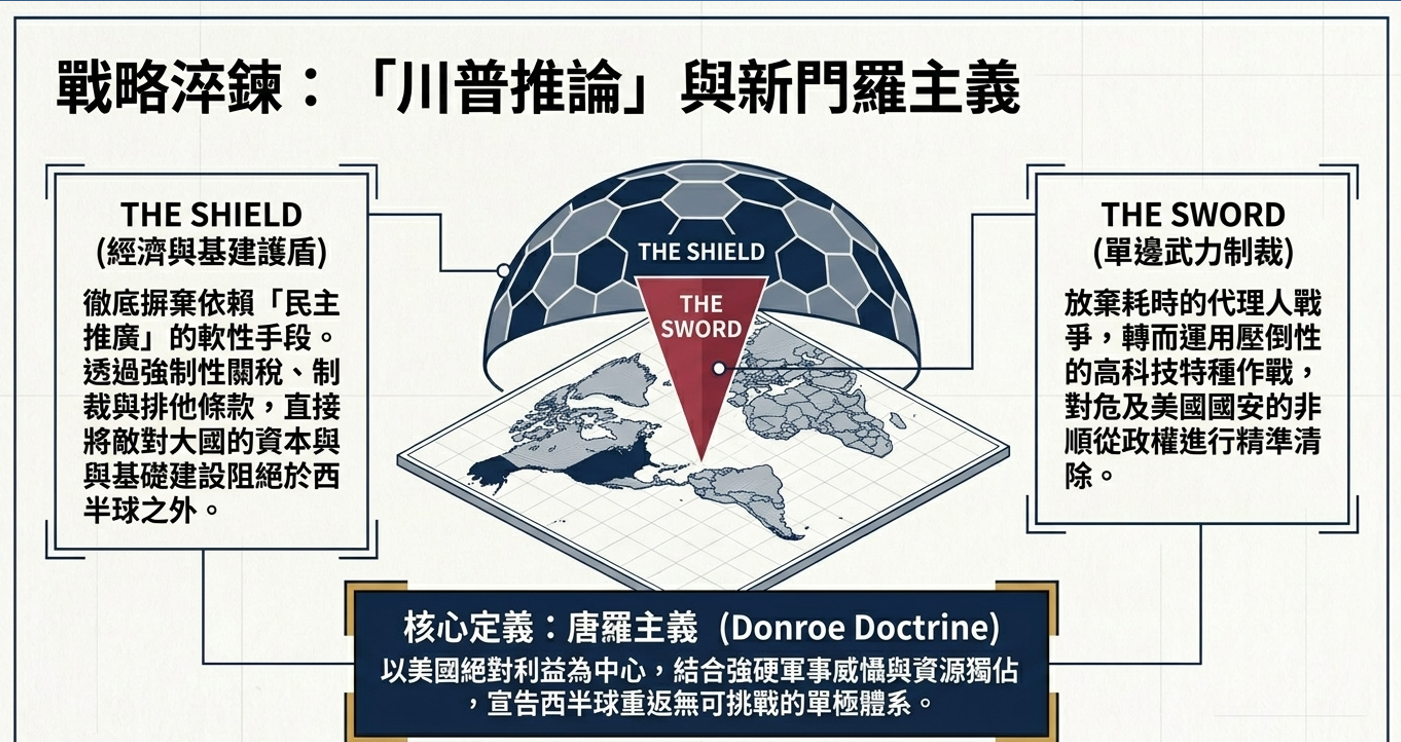 首先,美國對委內瑞拉所採取的並非傳統意義上的全面軍事行動,最早透過在加勒比海與南美北部維持航空母艦軍事部署、聯合演訓與反毒行動,最終對委內瑞拉進行「精準斬首軍事行動」的策略模式,同時以美國利益為中心的「川普推論」(Trump Corollary)或「唐羅主義」(Donroe Doctrine)外交模式值得長期觀察;針對美國在海外軍事行動風險與合法性考量,尤其美國於拉丁美洲進行特種部隊軍事行動介入顯示,由美國國會提案可以分析已轉向更具彈性與可持續性的新型態軍事介入模式。根據現實主義觀點下美國不止以委內瑞拉為軍事斬首為例子,形成對其他中美洲與南美洲美國家長期而穩定的威懾壓力,例如美國也再次指出古巴與哥倫比亞可能對於危及美國國家安全,同時美國將主導美洲事務並排除外來勢力介入,進而維持西半球單極體系主導的地緣政治目標。