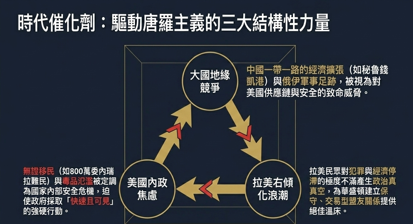 21世紀初至今中國透過國營企業持續對拉丁美洲國家進行商業與基礎建設投資,中國的經濟響力跟美國的投資已經於伯仲之間,尤其拉丁美洲國家擁有豐富天然資源的國家跟中國更多經濟投資的互動。尤其智利的銅礦、秘魯的巨型錢凱港與委內瑞拉的石油,這些拉美國家的左派領導人與中國的政經互動更是頻繁,這也是美國學者羅伯特•艾利斯對於中國於拉丁美洲的將近20年影響力,是由經濟層面進而影響拉美各國外交政策 ,於西半球的美國於拉美的議題,似乎已經不具有完全的影響力,川普總統正在此一局勢進行以美國利益為優先的外交決策,巴拿馬運河的港口收回是初步外交勝利宣示,美國對於委內瑞拉軍事行動是一次現實主義的硬實力的地緣戰略成果展示。