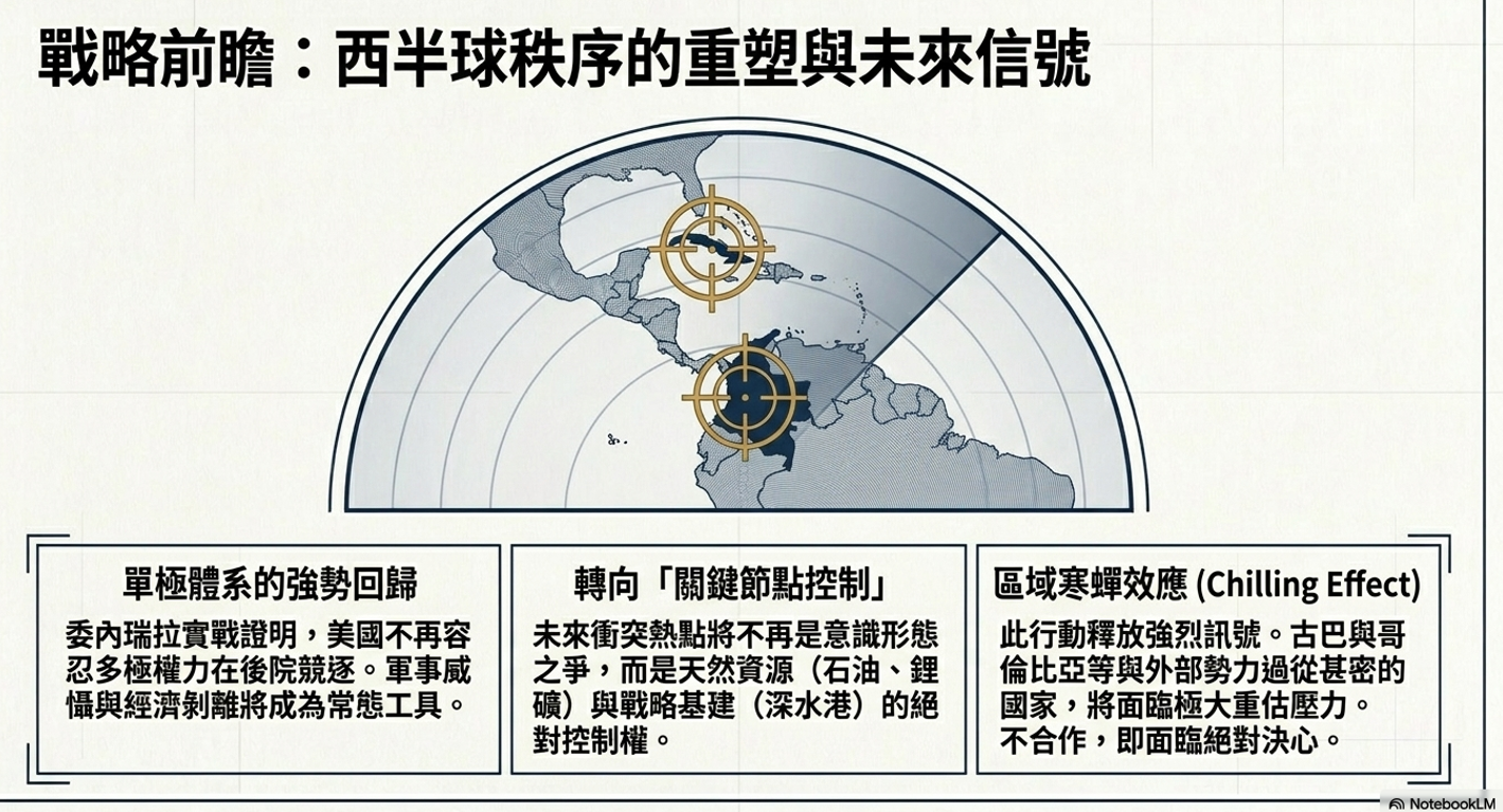 隨著中國在拉丁美洲地區影響力的持續上升,其以經濟合作與基礎建設合作發展為核心的對外政策,逐漸形成一種兼具短期可見性與長期持久性的權力投射模式,並在一定程度上對美國長期以移民安全議題與反毒制裁為主軸的區域介入方式構成影響與挑戰。委內瑞拉相關軍事斬首行動的經驗,不僅反映出拉丁美洲安全環境的結構性轉變,也凸顯21世紀大國如何在避免直接軍事衝突的前提下,透過間接手段展開權力競逐,從而成為觀察美國與拉丁美洲雙邊外交互動的重要代表性案例。在當前拉美地緣政治競爭加劇的新脈絡下,美國針對委內瑞拉所採取的軍事與外交作為,已不僅指向該國內部政治局勢,更具有向區域外國家釋放國家安全戰略訊號的象徵意涵,亦可被視為美國重申其全球影響力並向西半球延伸的重要國家安全與利益戰略實踐。