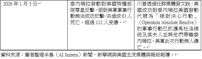 由表一可以看出美國對委內瑞拉軍事行動時間序,隨著馬杜洛遭美軍拘捕並遣送回紐約受審,2026年1月5日德爾西•羅德里格斯(Delcy Rodríguez)宣誓就任代理總統,同時川普政府承認代理總統並保持溝通管道。美國「絕對決心」軍事行動,此次直接進入委內瑞拉不僅僅是跨境抓捕行動,同時也是川普總統對於門羅主義在21世紀的重新演繹。